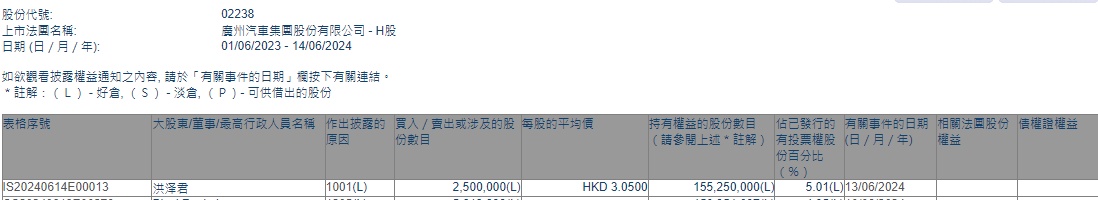 智通财经APP获悉,香港联交所最新资料显示,6月13日,洪泽君增持广汽集团(02238)250万股,每股作价3.05港元,总金额为762.5万港元。增持后最新持股数目约为1.55亿股,最新持股比例为5.01%。