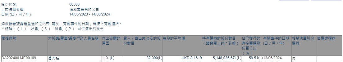 智通财经APP获悉,香港联交所最新资料显示,6月13日,董事会主席黄志祥增持信和置业(00083)3.2万股,每股作价8.1619港元,总金额约为26.12万港元。增持后最新持股数目约为51.48亿股,最新持股比例为59.51%。