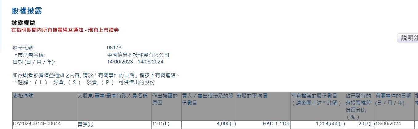 智通财经APP获悉,香港联交所最新资料显示,6月13日,董事会主席兼执行董事黃景兆增持中国信息科技(08178)4000万股,每股作价1.11港元,总金额约为4440港元。增持后最新持股数目约为125.46万股,最新持股比例为2.03%。