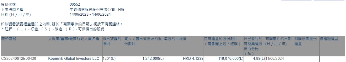 LLC减持中国通信服务(00552)124.2万股,每股作价4.1233港元,总金额约为512.11万港元。减持后最新持股数目约为1.19亿股,最新持股比例为4.98%。