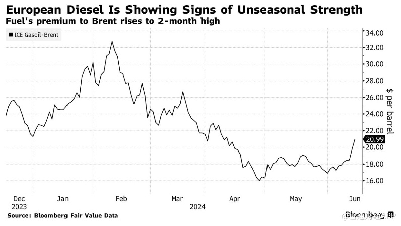 智通财经APP获悉,欧洲柴油市场正显示出趋紧的迹象,因为柴油相对于原油的溢价达到两个月来的高点。柴油裂解价差(衡量将原油转化为燃料的盈利能力)周五升至每桶21美元左右,为自4月15日以来的最高盘中水平,较周四的高点上涨了约60美分。现货价格相对于期货价格也有所上涨,这表明交易员认为市场正在趋紧。