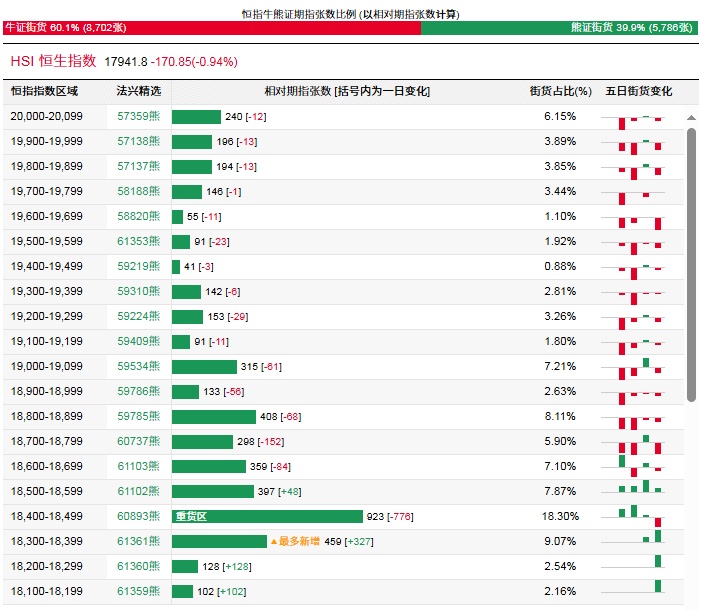 法兴恒指牛熊证街货分布图中的数据显示,熊证街货重货区在18400-18499区间,该区间最新熊证数量为923张,较上一交易减少776张;最多新增在18300-18399区间,该区间最新熊证数量为459张,较上一交易日增加327张。