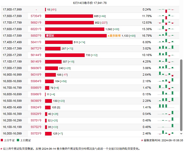 牛证街货重货区和最多新增都在17500-17599区间,该区间最新牛证数量为1133张,较上一交易日增加98张。