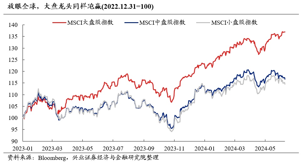 今年大盘、龙头风格成为全球市场重要的超额收益来源。以MSCI指数为参考,2023年以来MSCI大盘股指数累计上涨36.90%,远高于同期中盘、小盘股指数16.64%和14.45%的涨幅。