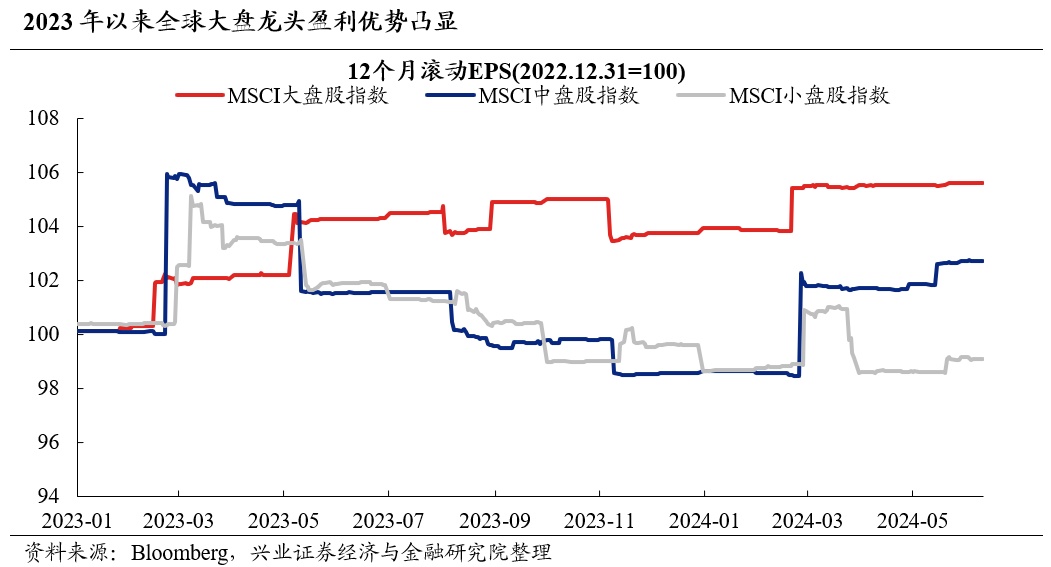 一方面是全球较为疲弱的宏观环境下,龙头企业相对其他股票的基本面优势不断扩大。我们看到,美国2024年一季度实际GDP年化季环比1.3%,明显低于预期的2.5%,也较前值3.4%显著回落。经济疲态逐步显现。欧元区更已为呵护经济降息。与之相对的,2023年以来龙头企业基本面却在持续改善,相对其他股票的盈利优势不断扩大。