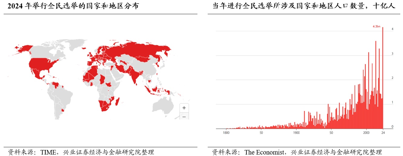 尤其是今年,更是全球“超级选举年”。据《经济学人》统计,2024年预计将有78个国家和地区举行总计83场全民性选举,涉及人口数量达42亿人,占全球人口的60%。其中,40个国家和地区将举行以领导人选举为代表的政府选举,或以议会、国会选举为代表的立法机构选举,占世界总人口的41%,GDP规模的42%。