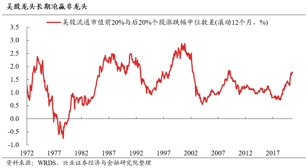 经济疲软、地缘动荡,不确定性加大的时代背景下,对确定性的追求、高胜率投资因此成为全球的共识。这其中,龙头作为天然的高胜率资产,也因此被全球资金拥抱。以美国为例,美股流通市值前20%的个股涨跌幅中位数,长期高于流通市值后20%的个股,指向龙头长期跑赢非龙头,是经得起时间检验的高胜率资产。