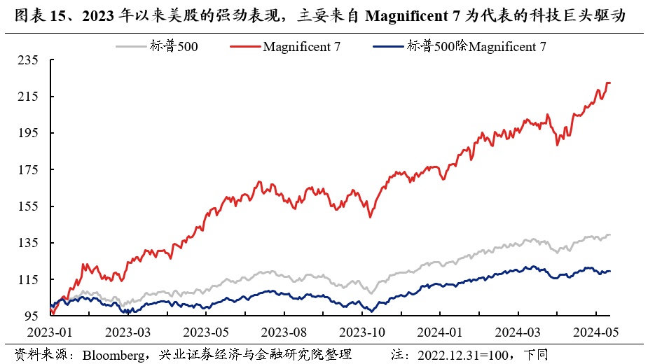 1、美国方面,以Magnificent 7为代表的高景气龙头驱动美股持续走牛。2023年以来,标普500指数和纳斯达克指数分别上涨39.26%、63.70%。而细究其上涨的原因,我们发现主要来自于以Magnificent 7(包括苹果、微软、谷歌、特斯拉、英伟达、亚马逊、Meta)为代表的科技巨头驱动,至今加权涨幅达122.25%。而当我们将这些龙头个股剔除后后,以标普500指数为参考,可以看到标普500指数剩余成分股市值加权收益水平仅为19.42%。