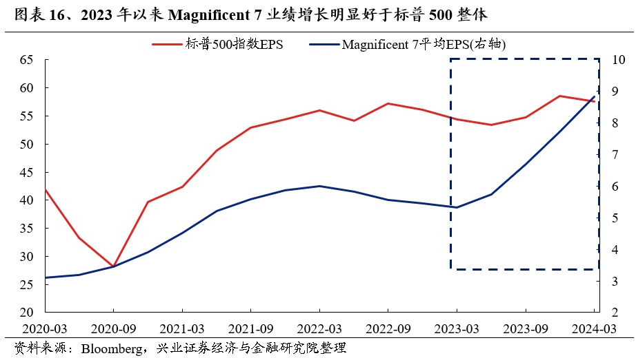 而美股Magnificent 7超额收益的背后,则是其持续兑现的高景气。我们看到,受益于AI产业浪潮驱动,2023年以来Magnificent 7业绩增长明显好于标普500整体。持续兑现的高景气,成为美股Magnificent 7持续领涨的最强基石。