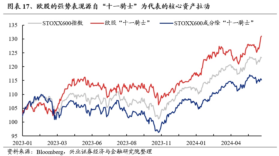 2、对于欧洲市场,则主要受到欧股“十一骑士”为代表的高质量核心资产拉动。2023年以来,以“十一骑士”(分别为葛兰素史克、罗氏、阿斯麦、诺华、雀巢、诺和诺德、欧莱雅、路威酩轩、阿斯利康、SAP和赛诺菲)为代表的欧股特色核心资产、权重龙头大幅上涨、持续领跑,并直接拉动欧洲股市大幅上行。而若我们剔除这些龙头企业,欧洲市场整体以震荡为主,收益并不明显。