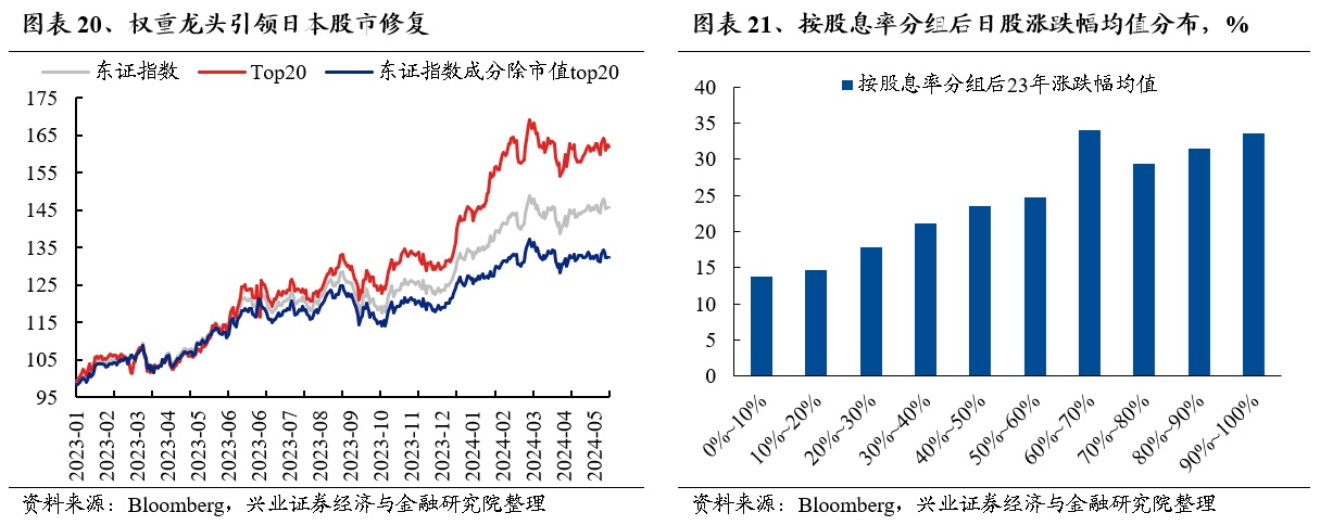 3、日本股市表现强势,核心是低估值、高股息龙头引领的估值修复。2023年以来日股表现与股息率呈明显的正相关,股息率越高,个股表现越好。与此同时,我们也看到作为日股2023年以来上涨最重要的增量资金来源,外资持股占比高的个股大多具备高股息率的特征。如巴菲特增持的三菱商事、伊藤忠商事等日本商社,2023年初时股息率分别在3.8%和3.2%左右,远高于当时不足0.5%的日本10年期国债利率。
