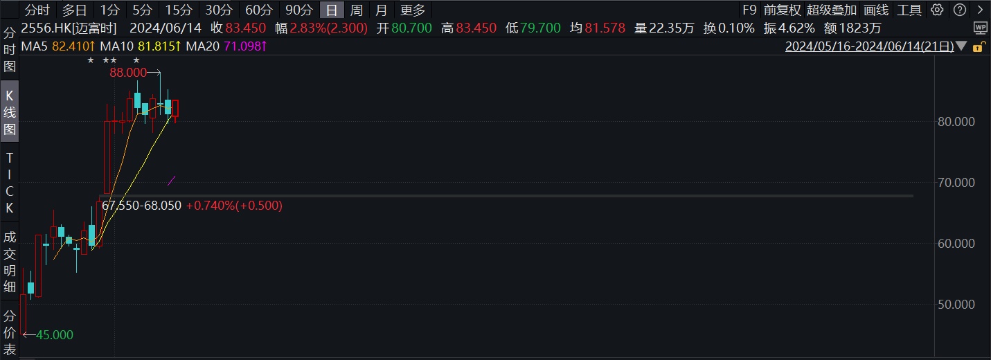 智通财经APP观察到,有国内营销及销售SaaS龙头之称的迈富时(02556)于今年5月16日正式于港股主板挂牌上市,其发行价为43.6港元,上市首日大涨超18%,此后该公司股价一路上涨,至6月12日最高涨至88港元。