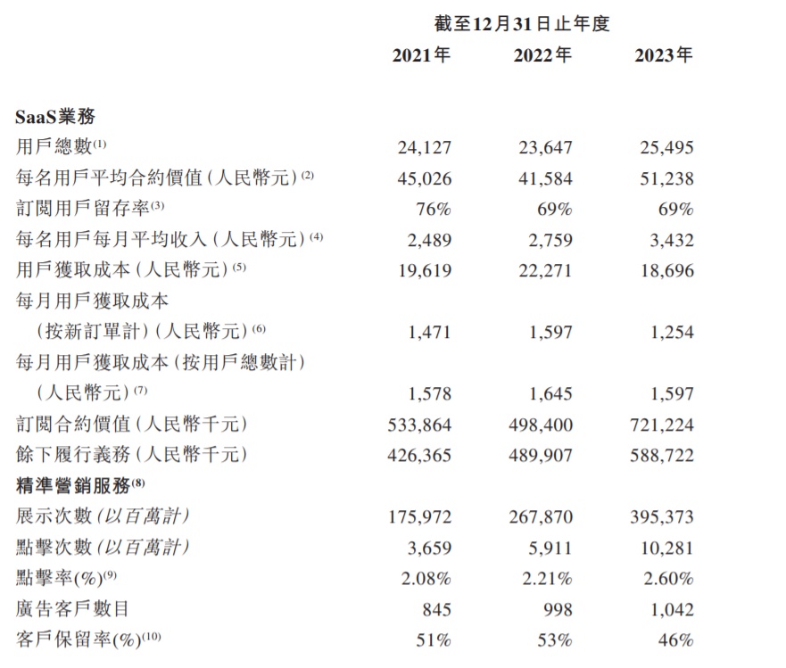 2021-2023年,迈富时SaaS业务的用户数目分别达到24127名、23647名及25495名(2022年的下滑是受疫情的影响),每名用户平均合约价值分别为45026元(人民币,下同)、41584元及51238元。