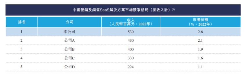 据弗若斯特沙利文数据显示,迈富时虽已成为国内最大的营销及销售SaaS解决方案提供商,但其2022年时所占的市场份额仅有2.6%。龙头玩家仅有低个位数的市场份额,可见该市场是极其分散且竞争剧烈的。