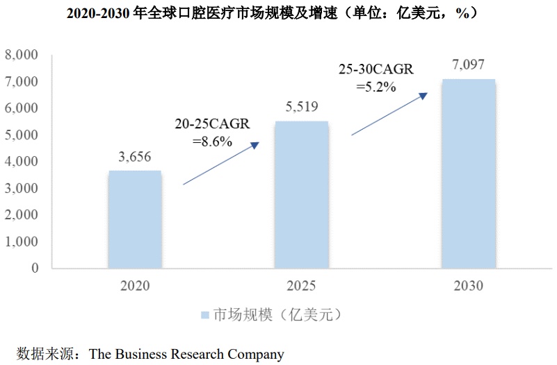 据了解,2020年全球口腔医疗市场规模达到3,656亿美元。随着老龄化进程加速,预计2020年-2025年全球口腔医疗市场将以8.6%的复合增速增长,至2025年全球市场规模将达到约5,519亿美元;伴随齿科美容需求的不断上升、民营口腔诊所的日益普及和口腔技术的进步,预计2025年-2030年全球口腔医疗市场将以5.2%的复合增速增长,至2030年全球市场规模将达到约7,097亿美元。