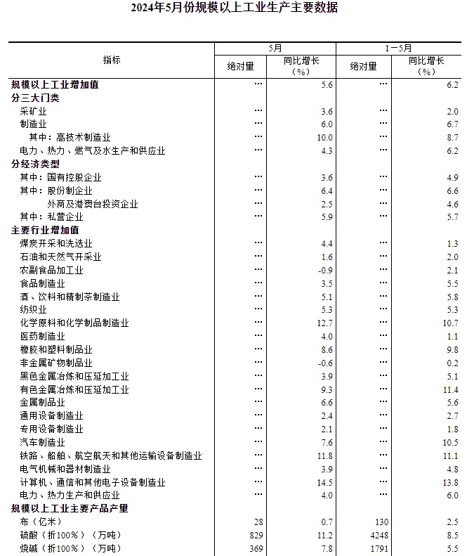 5月份,规模以上工业增加值同比实际增长5.6%(增加值增速均为扣除价格因素的实际增长率)。从环比看,5月份,规模以上工业增加值比上月增长0.30%。1—5月份,规模以上工业增加值同比增长6.2%。