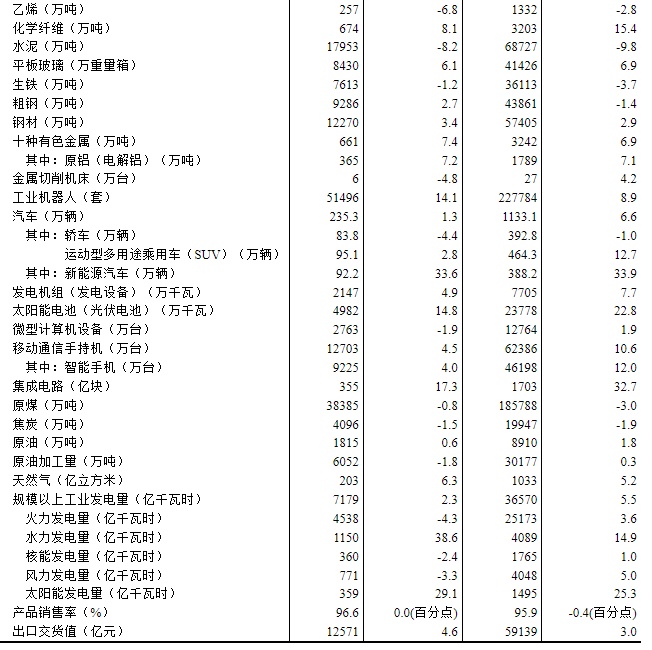 分产品看,5月份,619种产品中有352种产品产量同比增长。其中,钢材12270万吨,同比增长3.4%;水泥17953万吨,下降8.2%;十种有色金属661万吨,增长7.4%;乙烯257万吨,下降6.8%;汽车235.3万辆,增长1.3%,其中新能源汽车92.2万辆,增长33.6%;发电量7179亿千瓦时,增长2.3%;原油加工量6052万吨,下降1.8%。