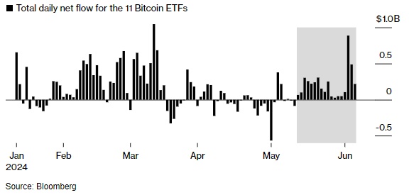 截至6月初,首批上市的比特币ETF在美国股市连续18天吸引资金净流入,创下比特币ETF前所未有的纪录,这一需求激增推动了比特币这一最大规模加密货币资产创下仅次于3月历史最高位的阶段性高点。根据机构汇编的数据,自1月11日推出以来,截至5月底,美股所有的首批比特币ETF产品的净认购额已达到156亿美元,总资产规模飙升至623亿美元。