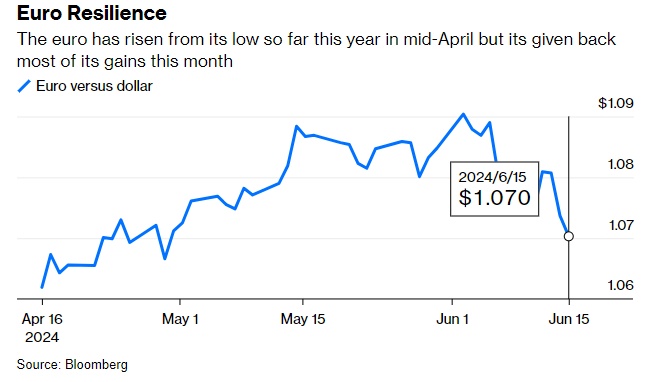 到目前为止,结果是欧元在过去一周略有下跌,但与美元六个月和一年的平均水平一致。由于 5 月份美国通胀报告弱于预期,导致美国国债收益率下降,以及极右翼政党在欧盟选举中获胜的影响,欧元陷入困境,交易员建议使用美元以外的其他外汇对对欧元进行押注。