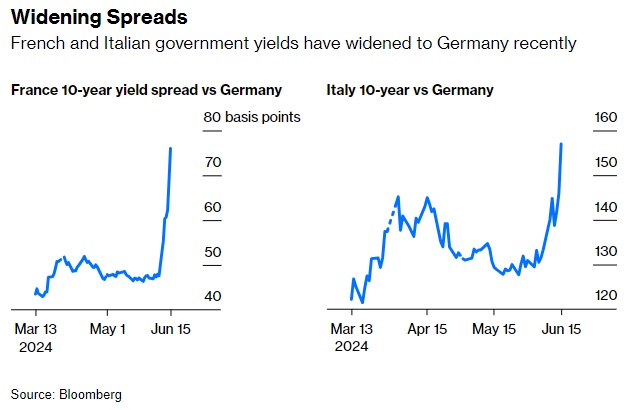 上周,在法国总统马克龙宣布提前选举后,欧盟议会的投票结果出现了新的变化。出现极右翼总理的前景,促使投资者抛售法国资产。法国退欧突然成为一个不容忽视的担忧,金融市场回避政治波动。德国执政联盟也遭受了类似的惨败,而反对党右翼政党的表现要好一些。唯一明显获胜的执政党是意大利总理梅洛尼的右翼意大利兄弟党。