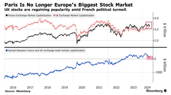 智通财经APP获悉,法国的政治动荡已导致该国失去了欧洲最大股票市场的地位,距离从英国手中夺走这一头衔还不到两年。
