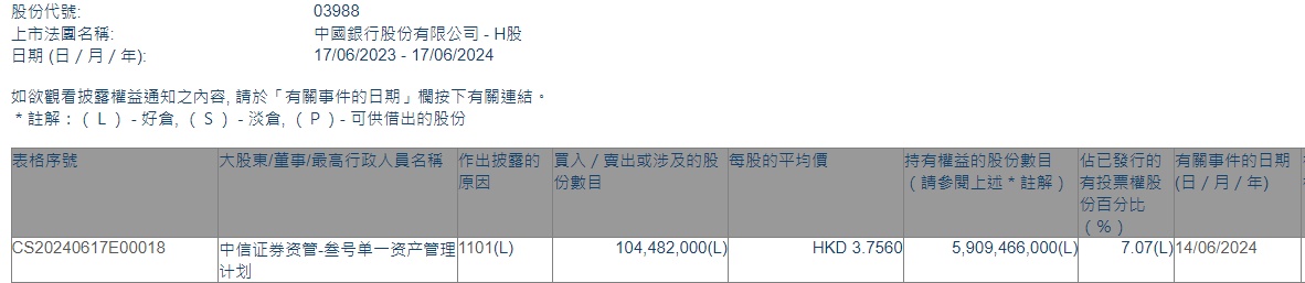 智通财经APP获悉,香港联交所最新资料显示,6月14日,中信证券资管-三号单一资产管理计划增持中国银行(03988)约1.04亿股,平均每股作价3.756港元,总金额约为3.9亿港元。增持后最新持股数目约为59.09亿股,持股比例为7.07%。