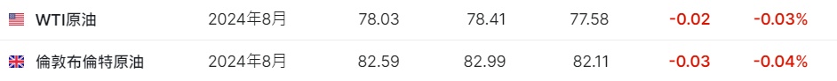 3. 截至发稿,WTI原油跌0.03%,报78.03美元/桶。布伦特原油跌0.04%,报82.59美元/桶。