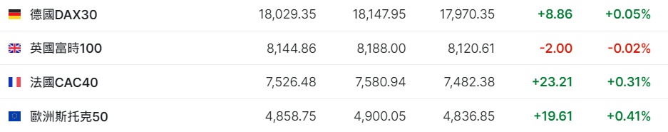 2. 截至发稿,德国DAX指数涨0.05%,英国富时100指数跌0.02%,法国CAC40指数涨0.31%,欧洲斯托克50指数涨0.41%。