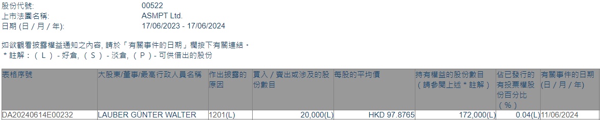 WALTER减持ASMPT(00522)2万股,平均每股作价97.8765港元,总金额为195.753万港元。减持后最新持股数目为17.2万股,持股比例为0.04%。