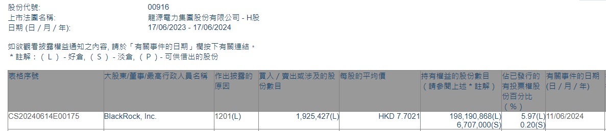 智通财经APP获悉,香港联交所最新资料显示,6月11日,贝莱德减持龙源电力(00916)192.5427万股,每股作价7.7021港元,总金额约为1482.98万港元。减持后最新持股数目约为1.98亿股,最新持股比例为5.97%。