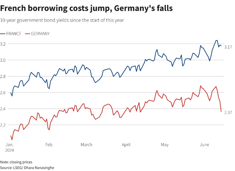 法国财政部长布鲁诺·勒梅尔上周五呼吁选民支持马克龙的中间派候选人,并警告称,如果极右翼或左翼赢得选举,可能会引发金融危机。与此同时,法国债务违约保险成本飙升至2020年5月以来的最高水平,借贷成本上升对银行业产生了冲击,导致该国三大银行股票大幅下跌。