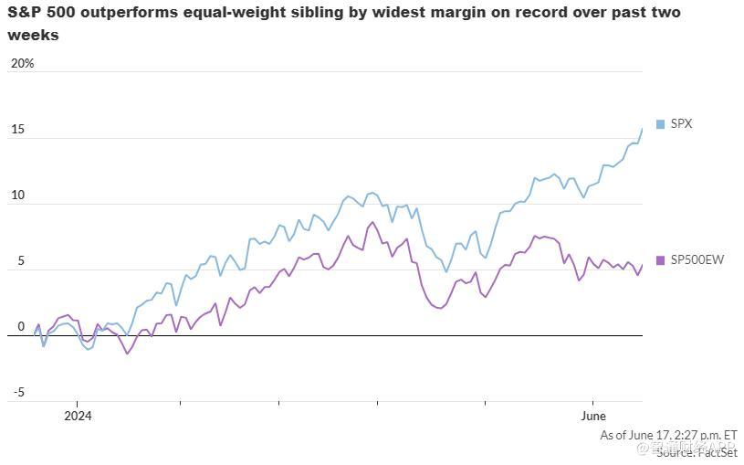 根据道琼斯市场数据公司的数据,从1990年以来,传统市值加权的标普500指数的表现首次连续两周超过标普500等权重指数2个百分点或更多。