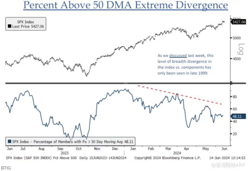 Krinsky指出,这是自1999年12月科技泡沫破灭前几个月以来从未出现过的情况。在过去一年的大部分时间里,美国股市的“糟糕广度”一直是投资专业人士广泛讨论的话题。
