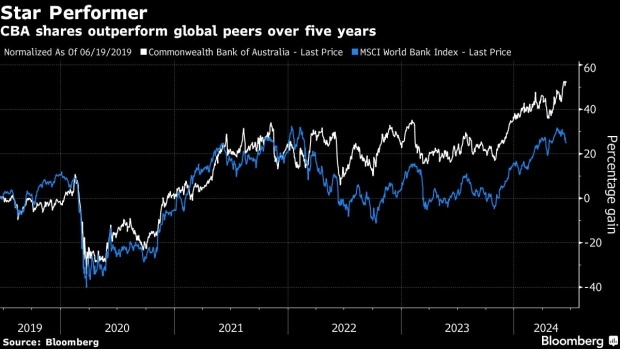 世界各地的银行股都受益于更高的利率,这也推动了澳大利亚金融股本月创下历史新高。过去一年,CBA的回报率约为37%,而MSCI全球银行指数的回报率为31%。目前,CBA的每股收益是其国内竞争对手澳大利亚国民银行(National Australia Bank Ltd.)、西太平洋银行(Westpac Banking Corp.)和澳新银行(ANZ Group Holdings Ltd.)的两倍多。