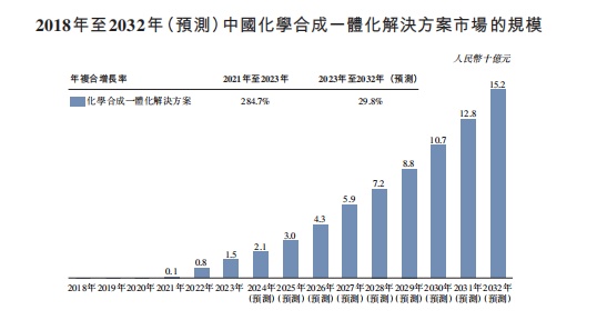 从行业来看,市场对化学合成解决方案的需求来自价值链下游行业的经营活动。固定资产投资及相关技术采购构成化学合成解决方案的相关市场规模。中国的化学合成一体化解决方案市场是化学合成解决方案市场中较小且不断增长的部分,于2023年达致价值人民币15亿元,2021年至2023年的年复合增长率为284.7%。预计到2032年该市场将大幅扩张并达致人民币152亿元,2023年至2032年的年复合增长率为29.8%。2021年之前,市场参与者为客户提供合同制造及开发服务且尚未提供一体化解决方案。