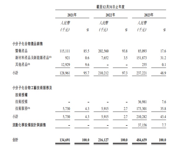 凌凯科技的业务主要包括小分子化合物产品销售、小分子化合物工艺技术授权及技术服务、流动化学设备设计与销售三部分。它致力于小分子化合物产品的开发、生产及销售,涵盖了医药、新材料和新能源等多个领域。报告期内,小分子化合物产品销售额分别为1.29亿元、2.10亿元及2.37亿元,占总营收比例的95.7%、97.3%及48.9%。同期的小分子化合物工艺技术服务及技术授权的收入分别为573.0万元、591.5万元及2.10亿元,占总收入比例的4.3%、2.7%及43.4%。