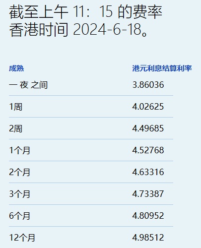 智通财经APP获悉,6月18日,港元拆息个别发展,隔夜息回落至3.86036%,与楼按相关的一个月拆息连升两天,报4.52768%,为4月2日以来最高。此外,两周拆息进一步涨至4.49685%,反映银行资金成本的三个月拆息维持4.73387%,六个月期亦无变动。一年期则微降至4.98512%。