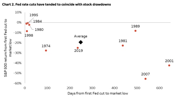 智通财经获悉,富国银行投资研究所(WFII)的数据显示,尽管投资者“叫嚷着”要求美联储开始降息,但历史表明,标普500指数的下跌可能与降息周期的启动同时发生。WFII投资策略分析师Austin Pickle在周一的一份报告中绘制了标普500指数的回报率,以及美联储在一个周期内首次降息至随后该指数低点之间的天数。他发现,自1974年以来,在美联储首次降息后的250天内,该指数的平均跌幅约为20%。他表示:“换句话说,投资者不应将首次降息等同于股市解除戒备的信号。”