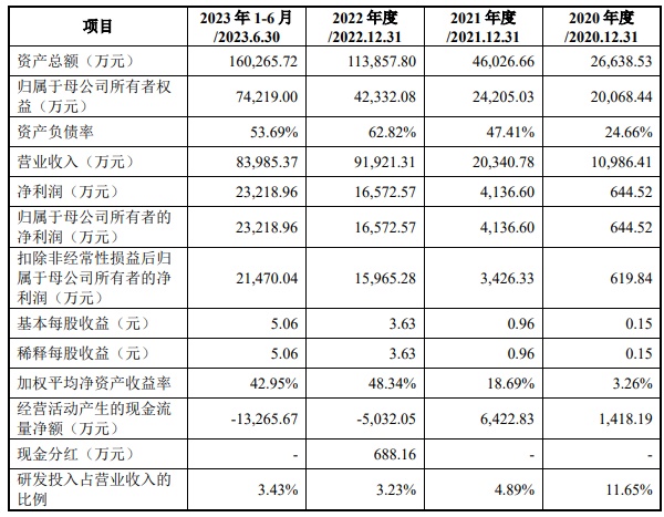 财务方面,金鸿新材于2020年度、2021年度、2022年度、2023年上半年分别实现营收约1.1亿、2.03亿、9.19亿、8.4亿人民币;同期,净利润分别为644.52万、4136.6万、1.66亿、2.32亿人民币。