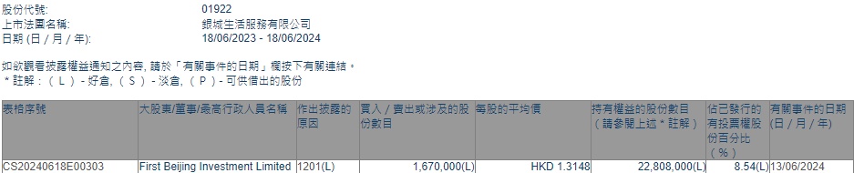 智通财经APP获悉,香港联交所最新资料显示,6月13日,第一北京投资减持银城生活服务(01922)167万股,平均每股作价1.3148港元,总金额约为219.57万港元。减持后最新持股数目为2280.8万股,持股比例为8.54%。