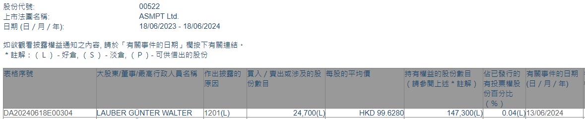 智通财经APP获悉,香港联交所最新资料显示,6月13日,LAUBER GÜNTER WALTER减持ASMPT(00522)2.47万股,平均每股作价99.628港元,总金额为246.08万港元。减持后最新持股数目为14.73万股,持股比例为0.04%。