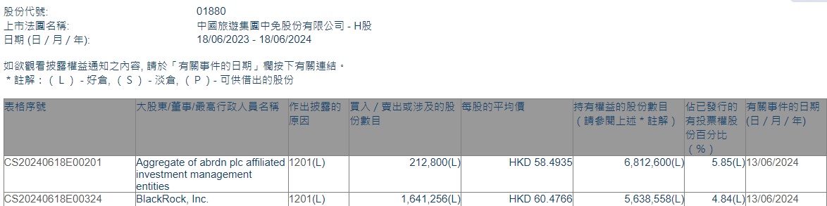 智通财经APP获悉,香港联交所最新资料显示,6月13日,贝莱德减持中国中免(01880)164.1256万股,每股作价60.4766港元,总金额约为9925.76万港元。减持后最新持股数目约为563.86万股,持股比例为4.84%。