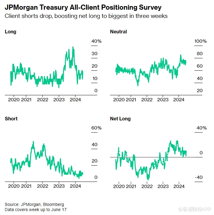 截至6月17日的当周,摩根大通对美国国债客户的调查显示,多头仓位上升6个百分点,令所有客户的净多头仓位升至5月20日以来最高水平。空头仓位下降2个百分点,中性仓位下降4个百分点。