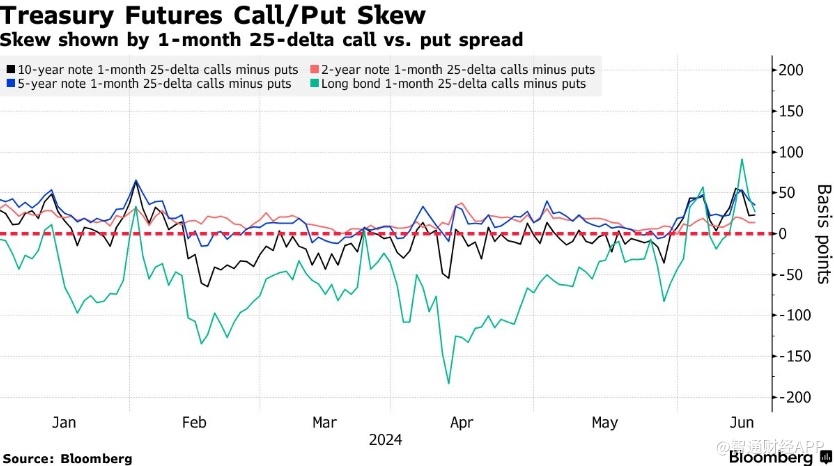 看涨期权溢价的回落得益于交易员平仓期货多头头寸,这似乎是周一抛售背后的主导力量。最近引人注目的美国国债期权交易包括以约3000万美元的溢价大量出售10年期债券9月看跌期权,周二的未平仓合约报告显示这是一笔新头寸。