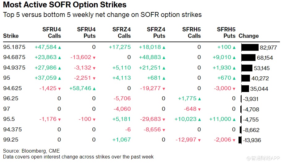 过去一周,截至3月25日的三大行权交易是SOFR 12月24日95.1875/94.9375/94.6875蝶式看跌合约,此类合约在上周五被大量买入。