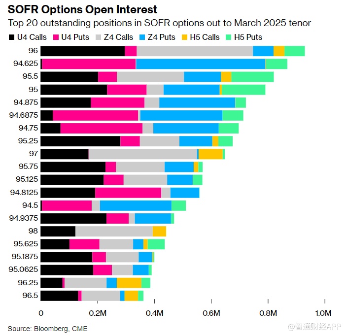 在截至3月25日的SOFR期权中,最活跃的是行权价为96.00的合约,相当于4%的利率。相关大宗交易包括SOFR 3月25日96.00/95.50/95.00和SOFR 9月25日96.75/96.00/95.25蝶式看跌合约。近期受欢迎的交易还包括SOFR 12月24日96.00/97.00看涨价差合约。