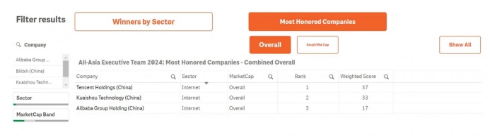 据悉,参与今年投票的机构在管理的亚洲股票总市值超过2万亿美元。该榜单也反映了资本市场尤其是买方和卖方专业人士对腾讯、阿里、快手等国内头部互联网公司在公司治理、战略执行、财务披露、投资者关系服务与沟通及ESG方面的充分肯定。其排名结果也成为全球投资风向标,受到买方投资者及卖方机构的认可。