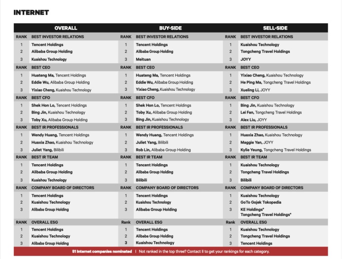 其中,亚洲互联网企业“最佳首席执行官”、“最佳首席财务官”、“最佳投资者关系专家”为个人奖项。位列“最佳首席执行官”前三的分别为腾讯马化腾、阿里吴泳铭和快手程一笑。位列“最佳首席财务官”前三的分别为腾讯罗硕瀚、快手金秉和阿里巴巴徐宏。位列“最佳投资者关系专家”前三的则分别为腾讯黄文迪、快手赵华夏和哔哩哔哩杨美玲。