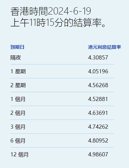 两周拆息升6基点至4.56268%,反映银行资金成本的三个月拆息维持4.74262%,为5月29日以来最高,六个月期维持4.80952%。一年期升至4.98607%。