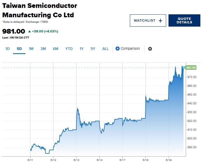 智通财经获悉,在芯片制造商英伟达(NVDA.US)乘着人工智能热潮周二成为全球市值最高的公司之后,亚洲半导体及相关股票周三也跟涨上涨。周二,英伟达股价上涨3.6%,市值达到3.34万亿美元,超过了目前市值3.32万亿美元的微软(MSFT.US),成为美股市值第一公司。而在本月早些时候,英伟达市值就首次突破3万亿美元,超过了苹果(AAPL.US)——成为美股市值亚军。今年以来,英伟达股价上涨了近174%。